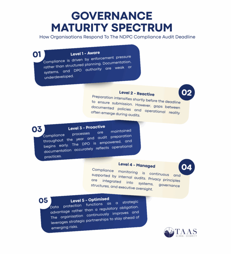 There are five types of organisations affected by this deadline, with their behaviours reflecting varied levels of governance maturity. The nascent Level One (Aware), features organisations demonstrating crisis-driven compliance characterised by missing deadlines or submitting incomplete documentation.
